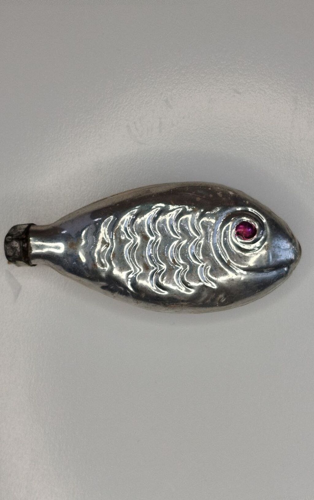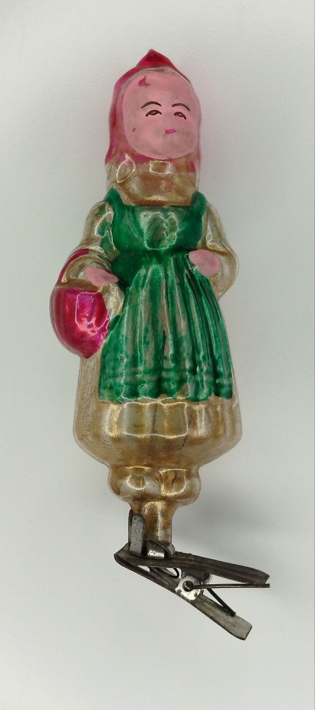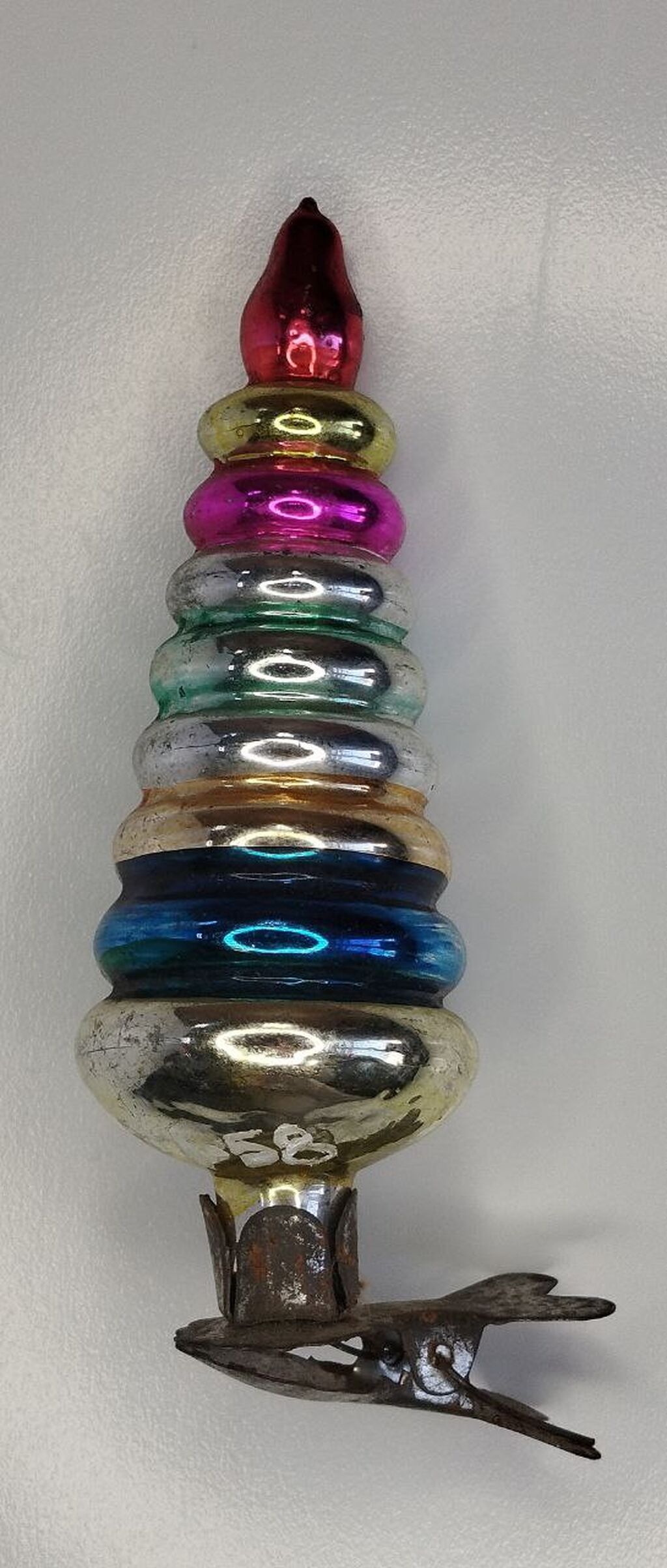 Елочная игрушка СССР на прищепке «Пирамидка». Выпуск 1950-1954 годов. Игрушка является подлинным образцом советского елочного декора середины прошлого века. Она несет в себе дух времени, отражая эстетику и технологии производства тех лет. Традиционное для того времени выдувное стекло, покрытое тонким слоем серебристого напыления и расписанное вручную. Это придает игрушке особую хрупкость и изящество.