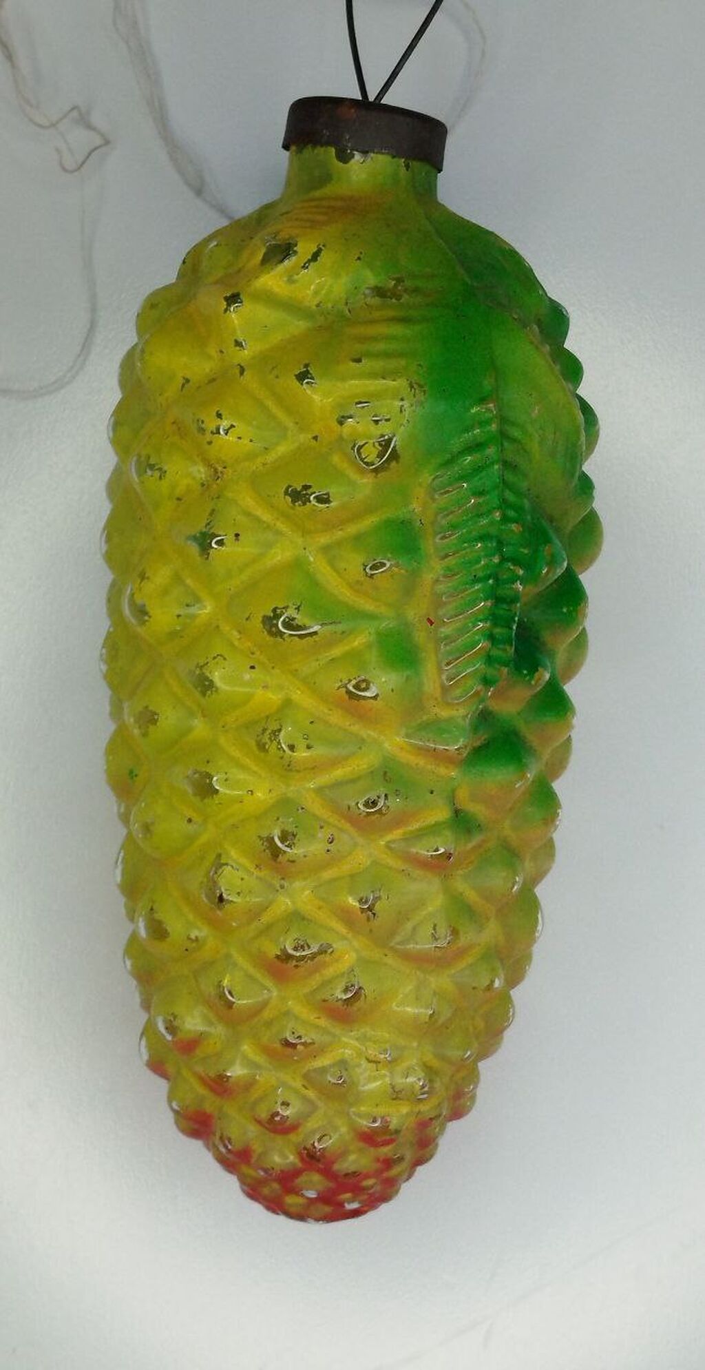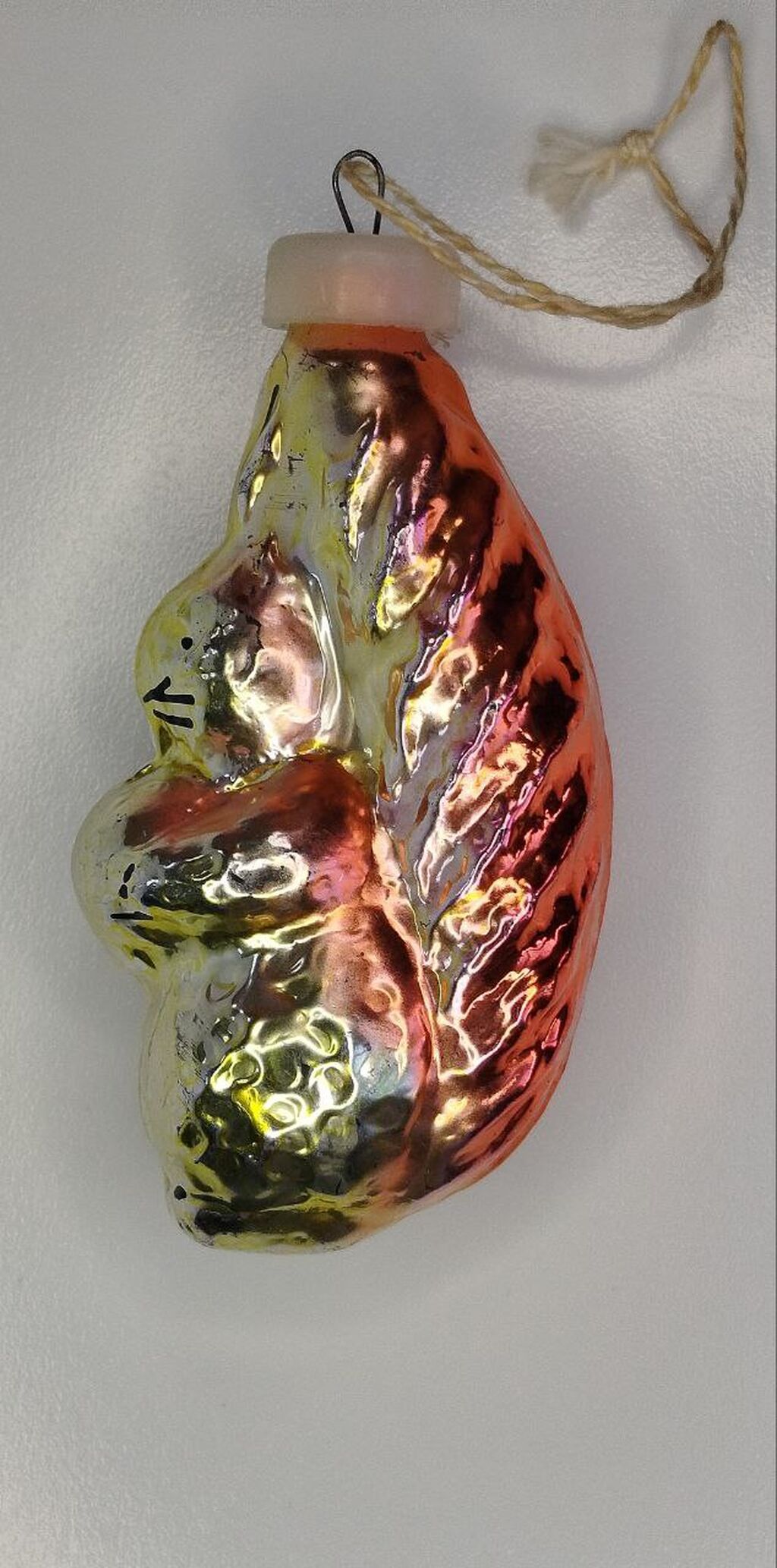 Винтажная елочная игрушка, выполненная из стекла и расписанная вручную. Изображает спелый початок кукурузы, символ изобилия и процветания, популярный в советской эстетике середины XX века. Игрушка выполнена из тонкого выдувного стекла, покрыта серебристым напылением и расписана вручную. Золотисто-желтые зерна кукурузы тщательно прорисованы, а зеленые листья, обнимающие початок, придают ему реалистичность и свежесть. Характерные для советских игрушек блестки добавляют праздничного сияния. Этот початок кукурузы – не просто украшение, это кусочек истории, отражающий идеологию и эстетику того времени, когда сельское хозяйство и его достижения были в центре внимания.